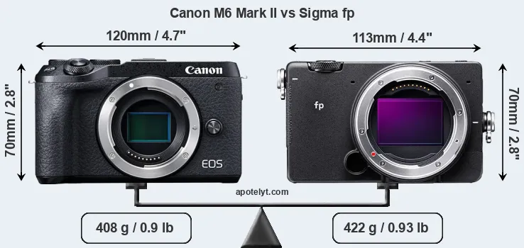 If the front view area (width x height) of the cameras is taken as an aggregate measure of their size, the Sigma fp is notably smaller (6 percent) than the Canon M6 Mark II. However, the fp is slightly heavier (3 percent) than the M6 Mark II. It is noteworthy in this context that the fp is splash and dust-proof, while the M6 Mark II does not feature any corresponding weather-sealing.