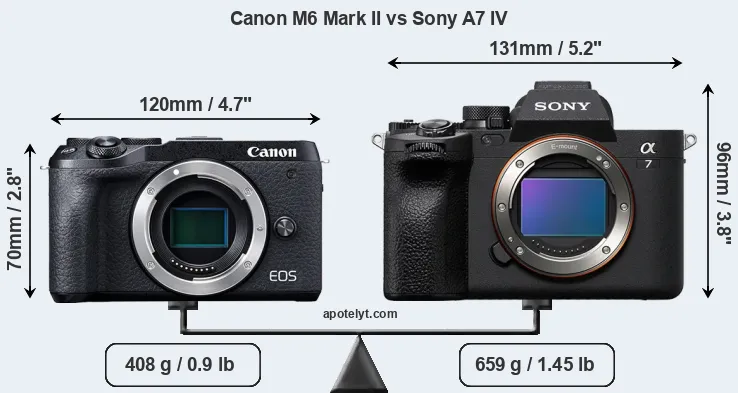 If the front view area (width x height) of the cameras is taken as an aggregate measure of their size, the Sony A7 IV is considerably larger (50 percent) than the Canon M6 Mark II. Moreover, the A7 IV is substantially heavier (62 percent) than the M6 Mark II. It is noteworthy in this context that the A7 IV is splash and dust-proof, while the M6 Mark II does not feature any corresponding weather-sealing.
