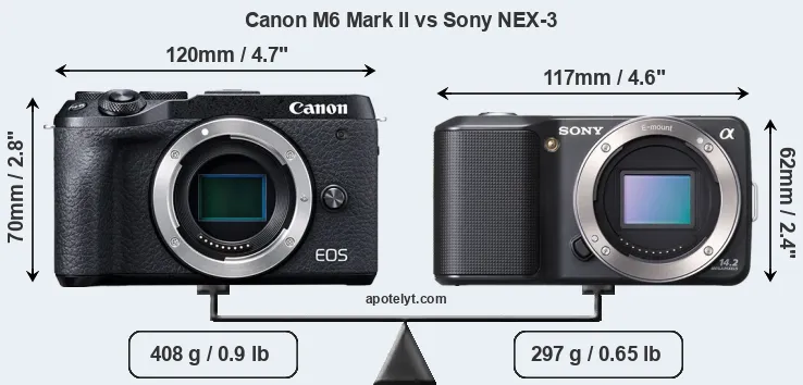 An illustration of the physical size and weight of the Canon M6 Mark II and the Sony NEX-3 is provided in the side-by-side display below. The two cameras are presented according to their relative size. Three consecutive perspectives from the front, the top, and the back are available. All width, height and depth dimensions are rounded to the nearest millimeter.
