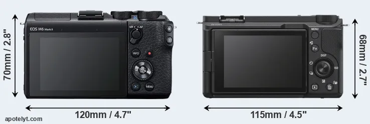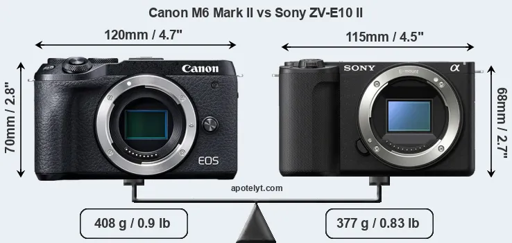 An illustration of the physical size and weight of the Canon M6 Mark II and the Sony ZV-E10 II is provided in the side-by-side display below. The two cameras are presented according to their relative size. Three consecutive views from the front, the top, and the rear side are shown. All width, height and depth measures are rounded to the nearest millimeter.
