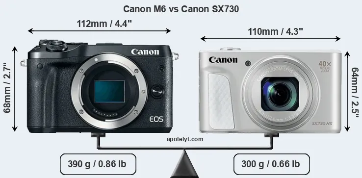 The physical size and weight of the Canon M6 and the Canon SX730 are illustrated in the side-by-side display below. The two cameras are presented according to their relative size. Three consecutive views from the front, the top, and the rear side are shown. All width, height and depth measures are rounded to the nearest millimeter.