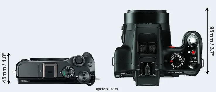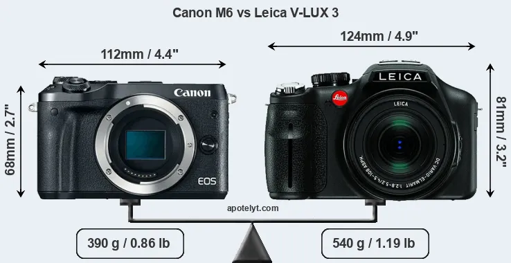 The side-by-side display below illustrates the physical size and weight of the Canon M6 and the Leica V-LUX 3. The two cameras are presented according to their relative size. Three consecutive perspectives from the front, the top, and the back are available. All width, height and depth measures are rounded to the nearest millimeter.