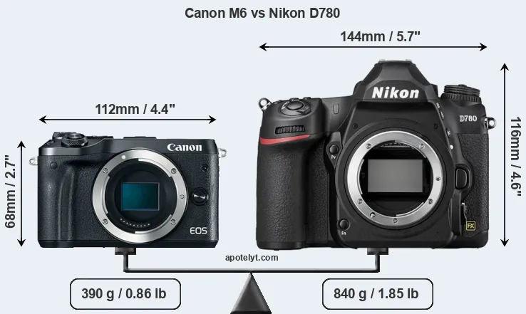 If the front view area (width x height) of the cameras is taken as an aggregate measure of their size, the Nikon D780 is considerably larger (119 percent) than the Canon M6. Moreover, the D780 is substantially heavier (115 percent) than the M6. It is noteworthy in this context that the D780 is splash and dust-proof, while the M6 does not feature any corresponding weather-sealing.