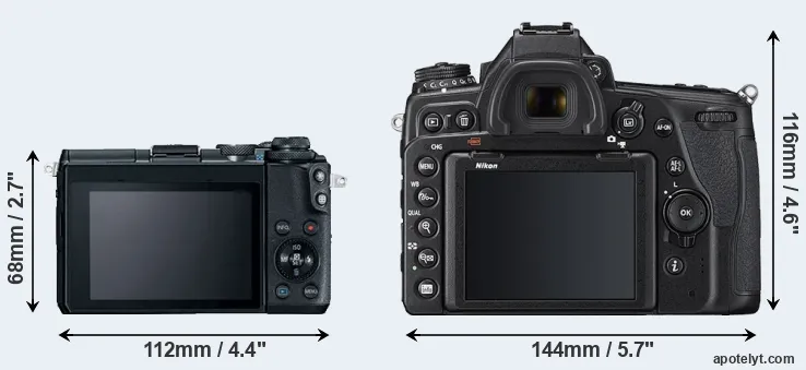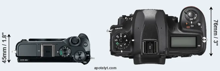 The physical size and weight of the Canon M6 and the Nikon D780 are illustrated in the side-by-side display below. The two cameras are presented according to their relative size. Three consecutive perspectives from the front, the top, and the back are available. All size dimensions are rounded to the nearest millimeter.