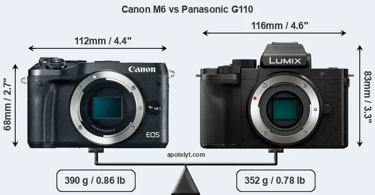 The side-by-side display below illustrates the physical size and weight of the Canon M6 and the Panasonic G110. The two cameras are presented according to their relative size. Three consecutive views from the front, the top, and the rear side are shown. All width, height and depth dimensions are rounded to the nearest millimeter.