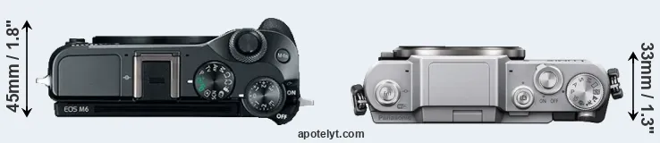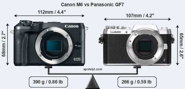 An illustration of the physical size and weight of the Canon M6 and the Panasonic GF7 is provided in the side-by-side display below. The two cameras are presented according to their relative size. Three successive views from the front, the top, and the rear are shown. All width, height and depth dimensions are rounded to the nearest millimeter.