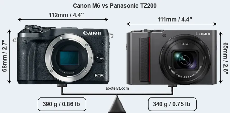 An illustration of the physical size and weight of the Canon M6 and the Panasonic TZ200 is provided in the side-by-side display below. The two cameras are presented according to their relative size. Three successive views from the front, the top, and the rear are shown. All width, height and depth dimensions are rounded to the nearest millimeter.