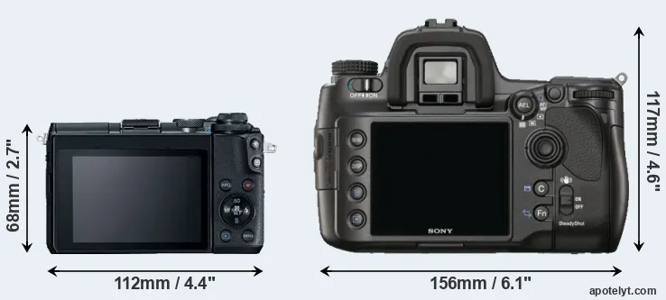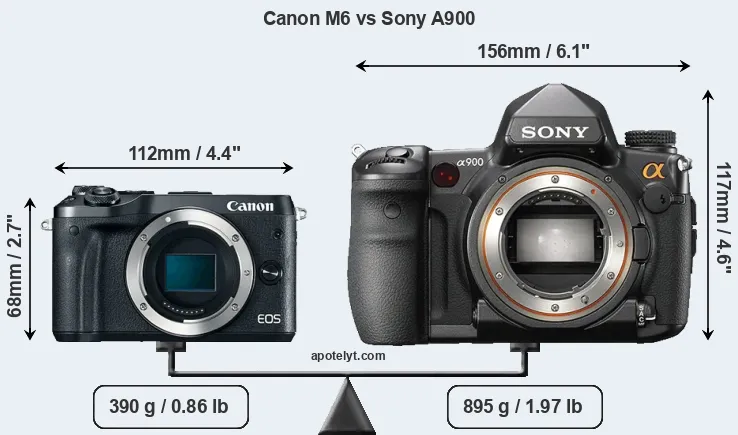 If the front view area (width x height) of the cameras is taken as an aggregate measure of their size, the Sony A900 is considerably larger (140 percent) than the Canon M6. Moreover, the A900 is substantially heavier (129 percent) than the M6. It is noteworthy in this context that the A900 is splash and dust-proof, while the M6 does not feature any corresponding weather-sealing.