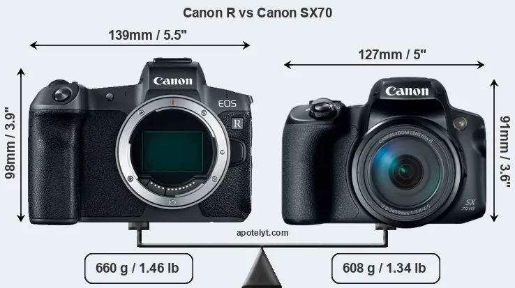 The physical size and weight of the Canon R and the Canon SX70 are illustrated in the side-by-side display below. The two cameras are presented according to their relative size. Three successive views from the front, the top, and the rear are shown. All width, height and depth measures are rounded to the nearest millimeter.