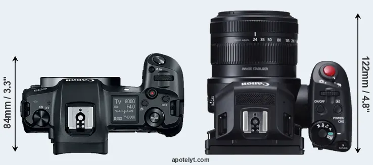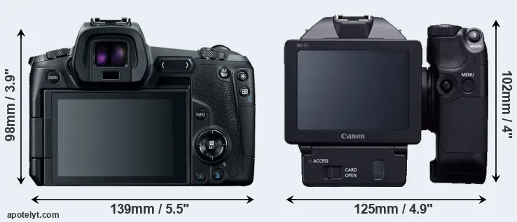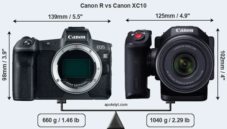 An illustration of the physical size and weight of the Canon R and the Canon XC10 is provided in the side-by-side display below. The two cameras are presented according to their relative size. Three consecutive perspectives from the front, the top, and the back are available. All width, height and depth dimensions are rounded to the nearest millimeter.