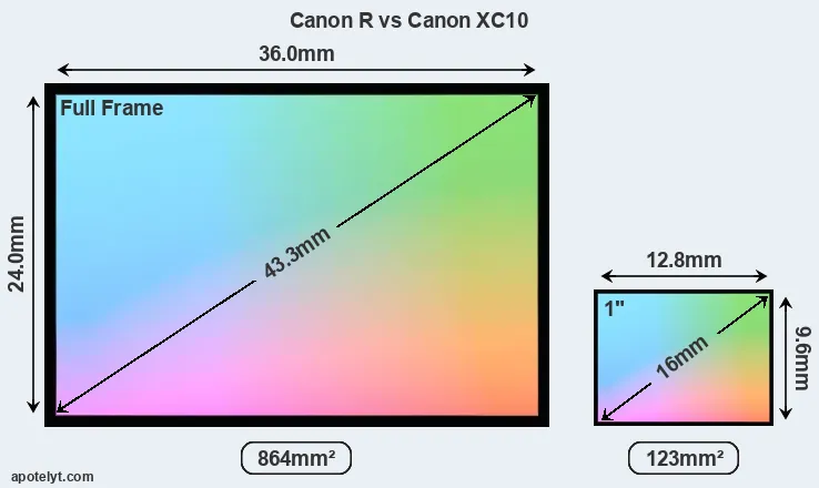 Of the two cameras under consideration, the Canon R features a full frame sensor and the Canon XC10 an one-inch sensor. The sensor area in the XC10 is 86 percent smaller. As a result of these sensor size differences, the cameras have a format factor of, respectively, 1.0 and 2.75. The sensor in the Canon R has a native 3:2 aspect ratio, while the one in the XC10 offers a 4:3 aspect.