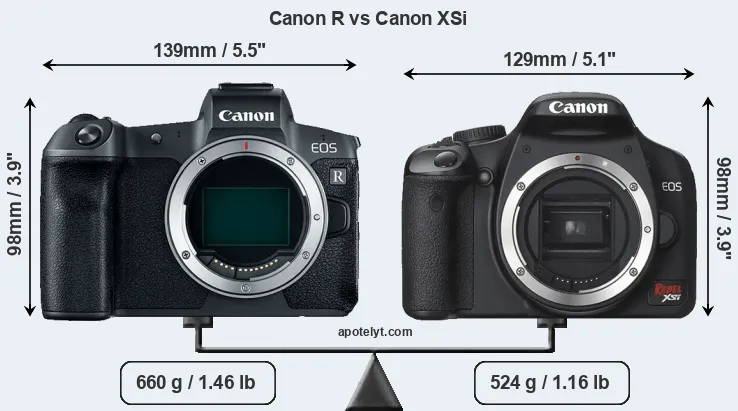 The side-by-side display below illustrates the physical size and weight of the Canon R and the Canon XSi. The two cameras are presented according to their relative size. Three consecutive perspectives from the front, the top, and the back are available. All width, height and depth measures are rounded to the nearest millimeter.