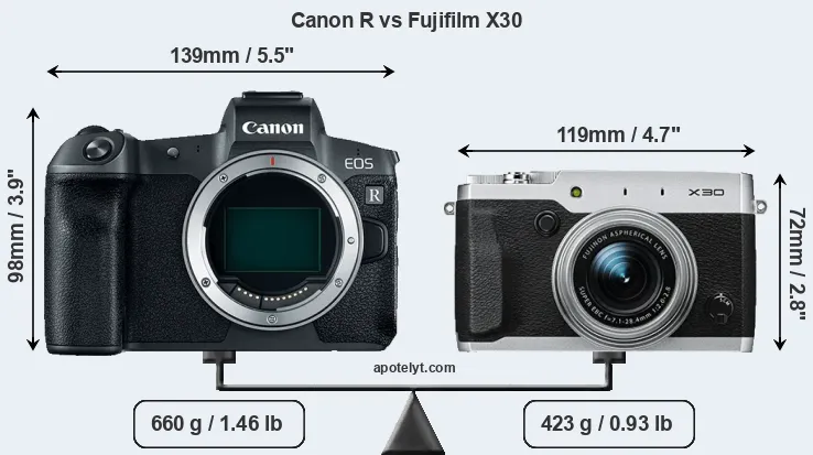 Of the two cameras under consideration, the Canon R features a full frame sensor and the Fujifilm X30 a 2/3 sensor. The sensor area in the X30 is 93 percent smaller. As a result of these sensor size differences, the cameras have a format factor of, respectively, 1.0 and 3.9. The sensor in the Canon R has a native 3:2 aspect ratio, while the one in the X30 offers a 4:3 aspect.