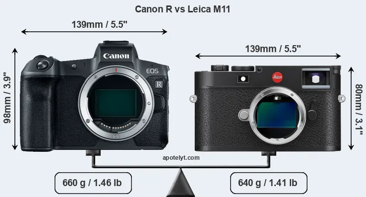The Canon EOS R and the Leica M11 (Typ 2416) are two digital cameras that were officially introduced, respectively, in September 2018 and January 2022. The Canon R is a mirrorless interchangeable lens camera, while the M11 is a rangefinder-focusing mirrorless. Both cameras are equipped with a full frame sensor. The Canon has a resolution of 30.1 megapixels, whereas the Leica provides 60.3 MP.