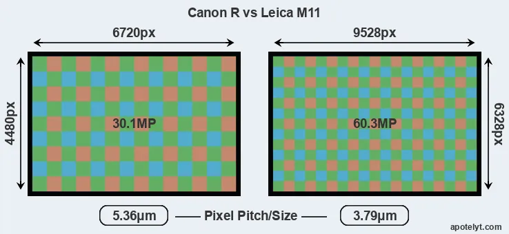 While the two cameras under review share the same sensor size, the M11 offers a higher resolution of 60.3 megapixels, compared with 30.1 MP of the Canon R. This megapixels advantage translates into a 42 percent gain in linear resolution. On the other hand, these sensor specs imply that the M11 has a higher pixel density and a smaller size of the individual pixel (with a pixel pitch of 3.79μm versus 5.36μm for the Canon R). However, it should be noted that the M11 is much more recent (by 3 years and 4 months) than the Canon R, and its sensor will have benefitted from technological advances during this time that compensate for the smaller pixel size. Coming back to sensor resolution, it should be mentioned that the M11 has no anti-alias filter installed, so that it can capture all the detail its sensor resolves.