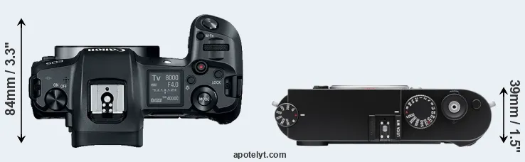 The side-by-side display below illustrates the physical size and weight of the Canon R and the Leica M11. The two cameras are presented according to their relative size. Three consecutive views from the front, the top, and the rear side are shown. All width, height and depth dimensions are rounded to the nearest millimeter.
