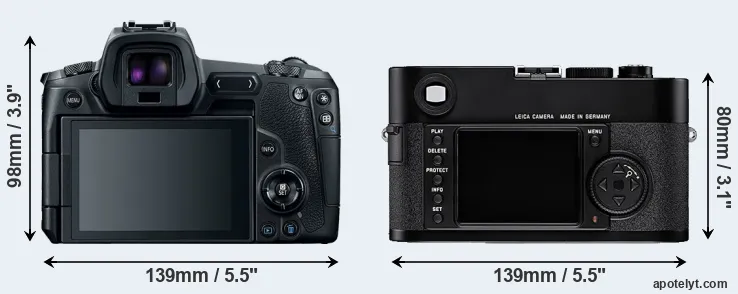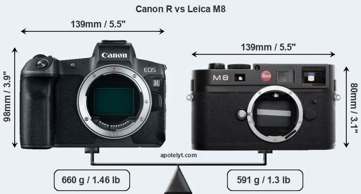 An illustration of the physical size and weight of the Canon R and the Leica M8 is provided in the side-by-side display below. The two cameras are presented according to their relative size. Three consecutive views from the front, the top, and the rear side are shown. All width, height and depth measures are rounded to the nearest millimeter.