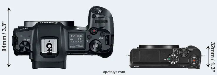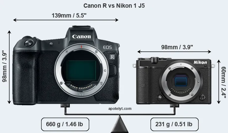 The physical size and weight of the Canon R and the Nikon 1 J5 are illustrated in the side-by-side display below. The two cameras are presented according to their relative size. Three successive views from the front, the top, and the rear are shown. All width, height and depth dimensions are rounded to the nearest millimeter.