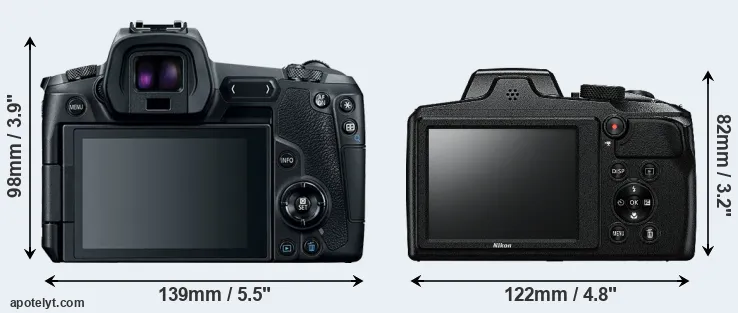 An illustration of the physical size and weight of the Canon R and the Nikon B600 is provided in the side-by-side display below. The two cameras are presented according to their relative size. Three consecutive perspectives from the front, the top, and the back are available. All width, height and depth dimensions are rounded to the nearest millimeter.