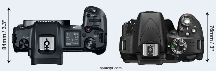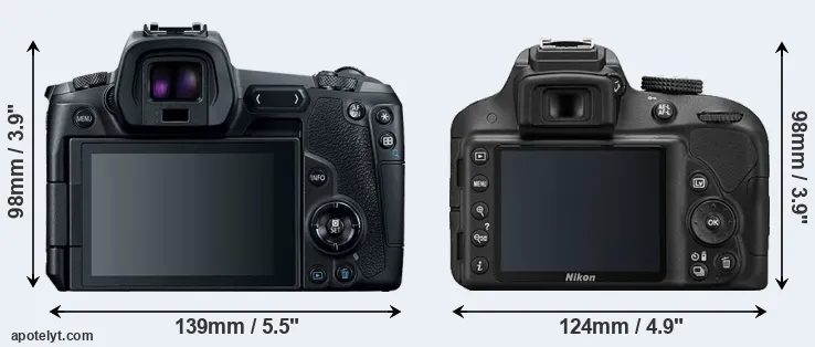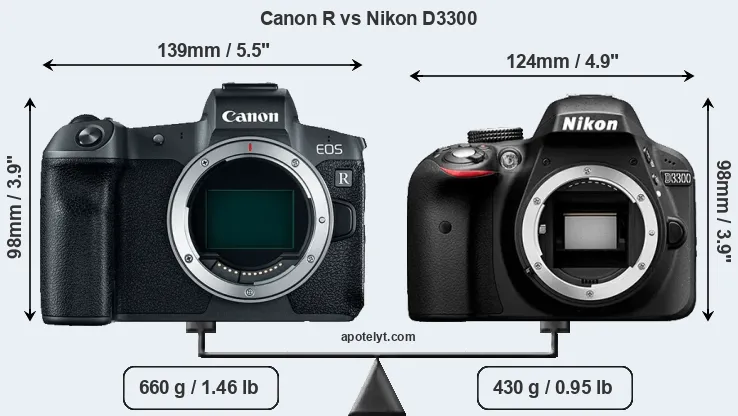 The side-by-side display below illustrates the physical size and weight of the Canon R and the Nikon D3300. The two cameras are presented according to their relative size. Three consecutive views from the front, the top, and the rear side are shown. All width, height and depth dimensions are rounded to the nearest millimeter.