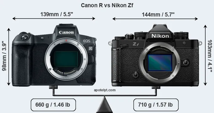 The side-by-side display below illustrates the physical size and weight of the Canon R and the Nikon Zf. The two cameras are presented according to their relative size. Three successive views from the front, the top, and the rear are shown. All size dimensions are rounded to the nearest millimeter.