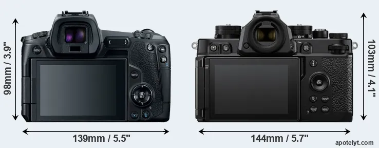 If the front view area (width x height) of the cameras is taken as an aggregate measure of their size, the Nikon Zf is notably larger (9 percent) than the Canon R. Moreover, the Zf is markedly heavier (8 percent) than the Canon R. In this context, it is worth noting that both cameras are splash and dust-proof and can, hence, be used in inclement weather conditions or harsh environments.