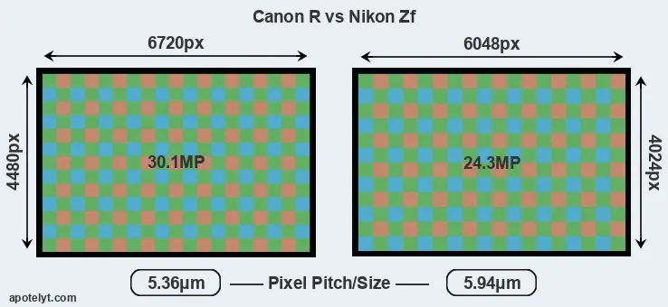 With 30.1MP, the Canon R offers a higher resolution than the Zf (24.3MP), but the Canon R has smaller individual pixels (pixel pitch of 5.36μm versus 5.94μm for the Zf). Moreover, the Zf is a much more recent model (by 5 years) than the Canon R, and its sensor will have benefitted from technological advances during this time that enhance the light gathering capacity of its pixels.