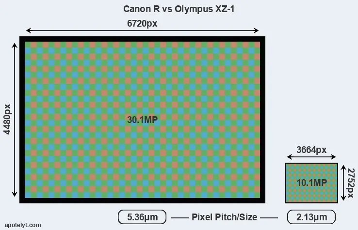 With 30.1MP, the Canon R offers a higher resolution than the XZ-1 (10.1MP), but the Canon R nevertheless has larger individual pixels (pixel pitch of 5.36μm versus 2.13μm for the XZ-1) due to its larger sensor. Moreover, the Canon R is a much more recent model (by 7 years and 8 months) than the XZ-1, and its sensor will have benefitted from technological advances during this time that further enhance the light gathering capacity of its pixels.