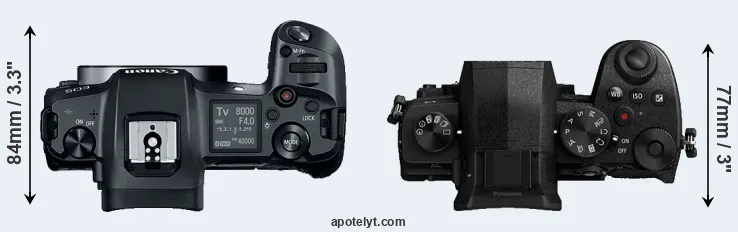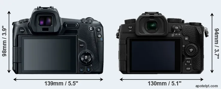 The side-by-side display below illustrates the physical size and weight of the Canon R and the Panasonic G95. The two cameras are presented according to their relative size. Three consecutive perspectives from the front, the top, and the back are available. All width, height and depth dimensions are rounded to the nearest millimeter.