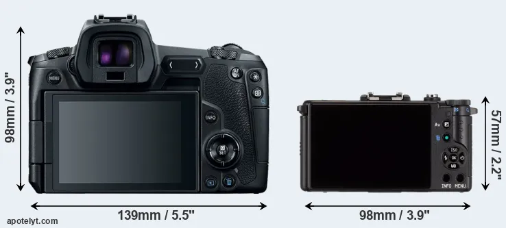 The side-by-side display below illustrates the physical size and weight of the Canon R and the Pentax Q. The two cameras are presented according to their relative size. Three consecutive perspectives from the front, the top, and the back are available. All width, height and depth measures are rounded to the nearest millimeter.