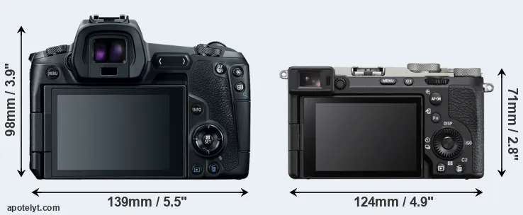 The side-by-side display below illustrates the physical size and weight of the Canon R and the Sony A7C II. The two cameras are presented according to their relative size. Three consecutive views from the front, the top, and the rear side are shown. All width, height and depth measures are rounded to the nearest millimeter.