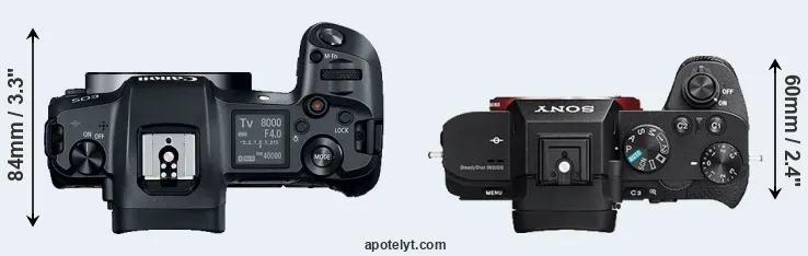 The physical size and weight of the Canon R and the Sony A7R II are illustrated in the side-by-side display below. The two cameras are presented according to their relative size. Three consecutive views from the front, the top, and the rear side are shown. All size dimensions are rounded to the nearest millimeter.