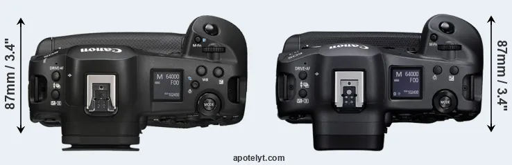 The physical size and weight of the Canon R1 and the Canon R3 are illustrated in the side-by-side display below. The two cameras are presented according to their relative size. Three consecutive perspectives from the front, the top, and the back are available. All size dimensions are rounded to the nearest millimeter.