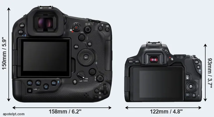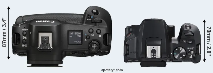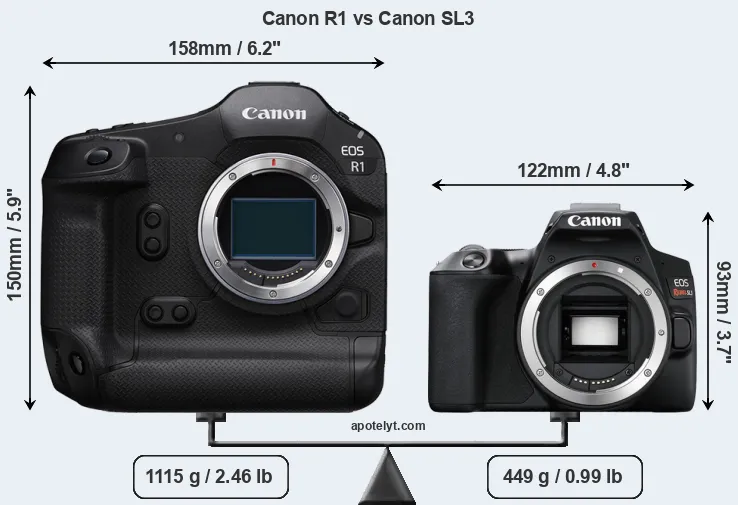 The side-by-side display below illustrates the physical size and weight of the Canon R1 and the Canon SL3. The two cameras are presented according to their relative size. Three successive views from the front, the top, and the rear are shown. All size dimensions are rounded to the nearest millimeter.