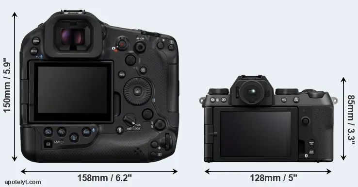 The physical size and weight of the Canon R1 and the Fujifilm X-S20 are illustrated in the side-by-side display below. The two cameras are presented according to their relative size. Three successive views from the front, the top, and the rear are shown. All width, height and depth measures are rounded to the nearest millimeter.