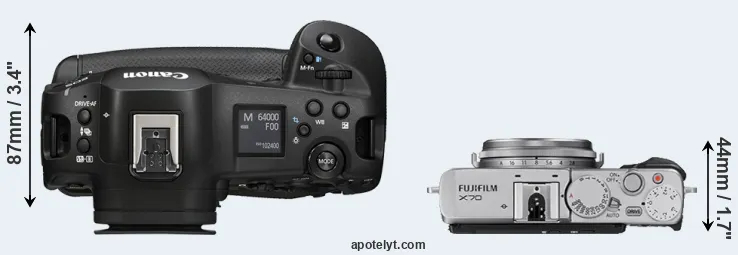 An illustration of the physical size and weight of the Canon R1 and the Fujifilm X70 is provided in the side-by-side display below. The two cameras are presented according to their relative size. Three consecutive views from the front, the top, and the rear side are shown. All width, height and depth measures are rounded to the nearest millimeter.