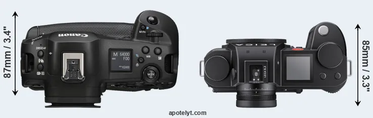 The side-by-side display below illustrates the physical size and weight of the Canon R1 and the Leica SL3. The two cameras are presented according to their relative size. Three consecutive perspectives from the front, the top, and the back are available. All width, height and depth measures are rounded to the nearest millimeter.
