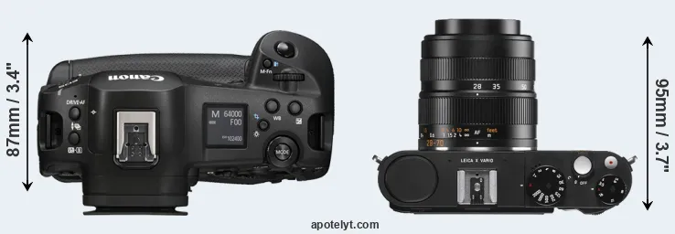 An illustration of the physical size and weight of the Canon R1 and the Leica X Vario is provided in the side-by-side display below. The two cameras are presented according to their relative size. Three consecutive perspectives from the front, the top, and the back are available. All size dimensions are rounded to the nearest millimeter.
