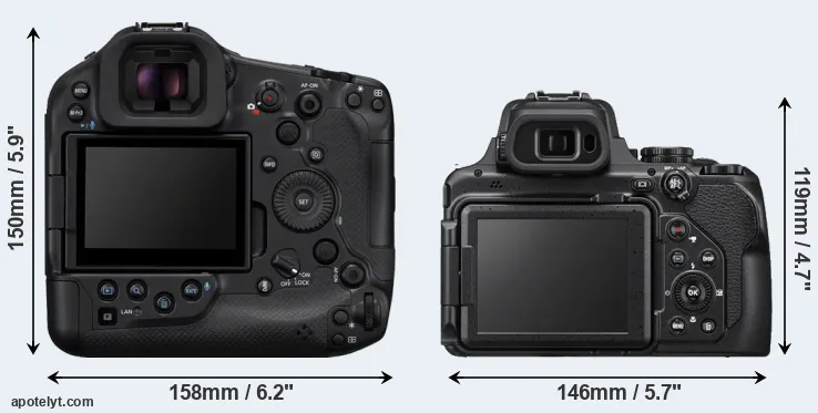 The side-by-side display below illustrates the physical size and weight of the Canon R1 and the Nikon P1000. The two cameras are presented according to their relative size. Three consecutive perspectives from the front, the top, and the back are available. All width, height and depth measures are rounded to the nearest millimeter.