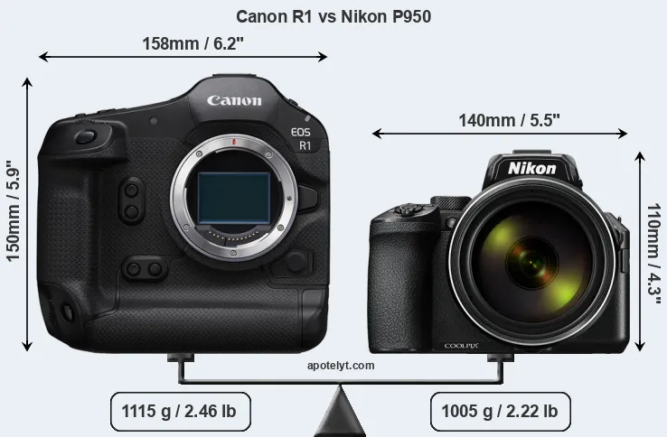 An illustration of the physical size and weight of the Canon R1 and the Nikon P950 is provided in the side-by-side display below. The two cameras are presented according to their relative size. Three consecutive perspectives from the front, the top, and the back are available. All size dimensions are rounded to the nearest millimeter.