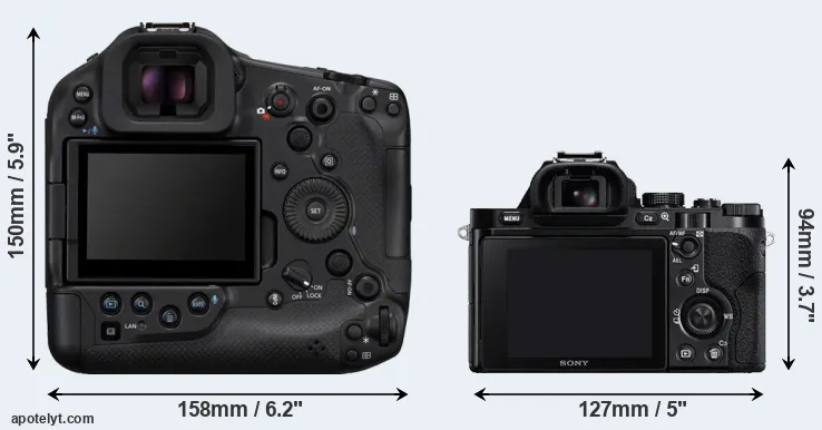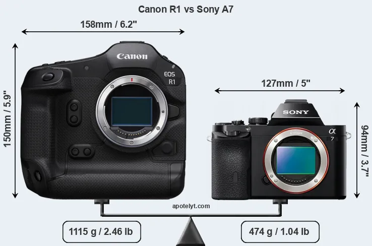 The side-by-side display below illustrates the physical size and weight of the Canon R1 and the Sony A7. The two cameras are presented according to their relative size. Three consecutive views from the front, the top, and the rear side are shown. All width, height and depth dimensions are rounded to the nearest millimeter.