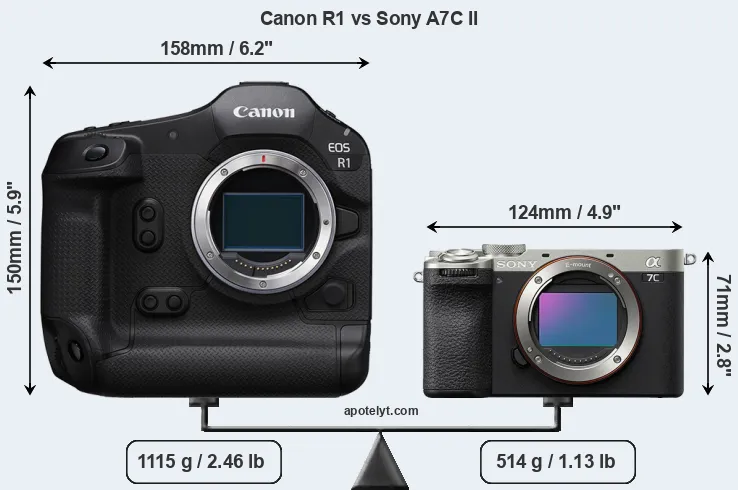 If the front view area (width x height) of the cameras is taken as an aggregate measure of their size, the Sony A7C II is considerably smaller (63 percent) than the Canon R1. Moreover, the A7C II is substantially lighter (54 percent) than the R1. In this context, it is worth noting that both cameras are splash and dust-proof and can, hence, be used in inclement weather conditions or harsh environments.