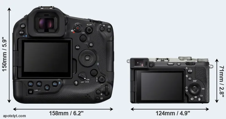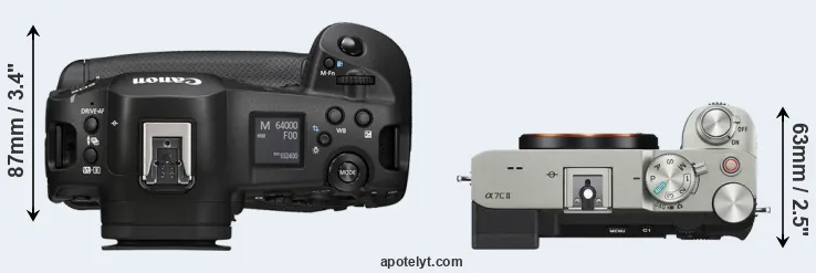An illustration of the physical size and weight of the Canon R1 and the Sony A7C II is provided in the side-by-side display below. The two cameras are presented according to their relative size. Three consecutive views from the front, the top, and the rear side are shown. All width, height and depth measures are rounded to the nearest millimeter.