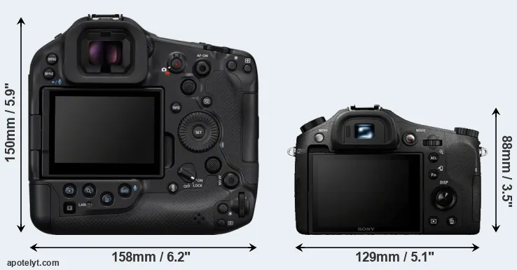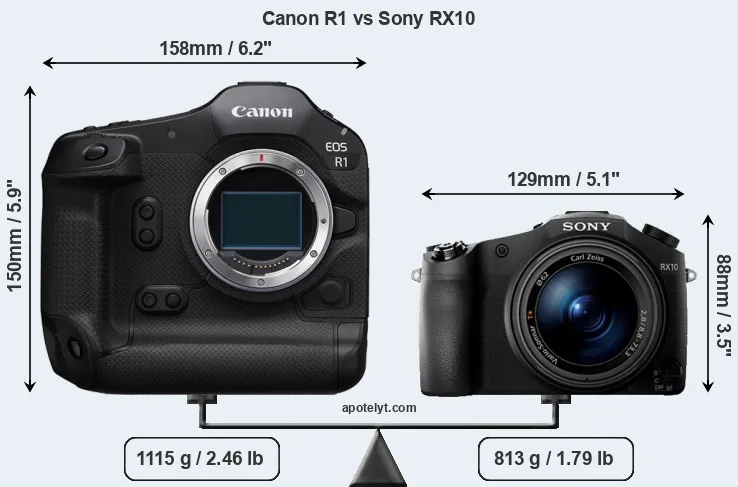 The physical size and weight of the Canon R1 and the Sony RX10 are illustrated in the side-by-side display below. The two cameras are presented according to their relative size. Three consecutive perspectives from the front, the top, and the back are available. All width, height and depth dimensions are rounded to the nearest millimeter.