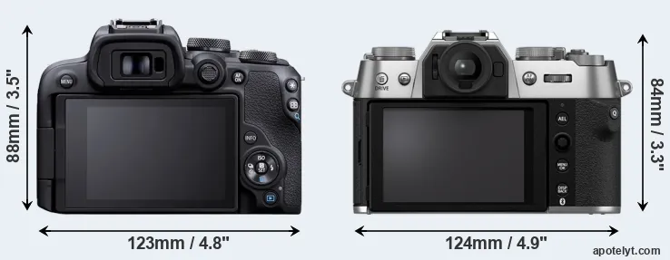 If the front view area (width x height) of the cameras is taken as an aggregate measure of their size, the Fujifilm X-T50 is somewhat smaller (4 percent) than the Canon R10. However, the X-T50 is slightly heavier (2 percent) than the R10. In this context, it is worth noting that neither the R10 nor the X-T50 are weather-sealed.