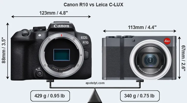 An illustration of the physical size and weight of the Canon R10 and the Leica C-LUX is provided in the side-by-side display below. The two cameras are presented according to their relative size. Three consecutive perspectives from the front, the top, and the back are available. All width, height and depth dimensions are rounded to the nearest millimeter.