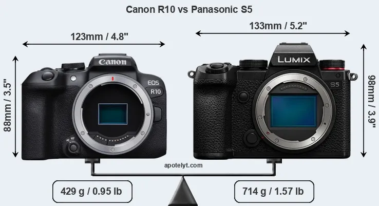 If the front view area (width x height) of the cameras is taken as an aggregate measure of their size, the Panasonic S5 is notably larger (20 percent) than the Canon R10. Moreover, the S5 is substantially heavier (66 percent) than the R10. It is noteworthy in this context that the S5 is splash and dust-proof, while the R10 does not feature any corresponding weather-sealing.