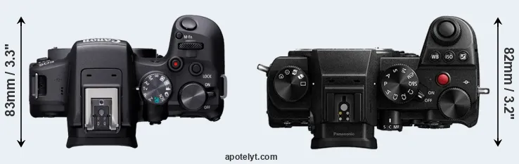 The side-by-side display below illustrates the physical size and weight of the Canon R10 and the Panasonic S5. The two cameras are presented according to their relative size. Three consecutive perspectives from the front, the top, and the back are available. All size dimensions are rounded to the nearest millimeter.