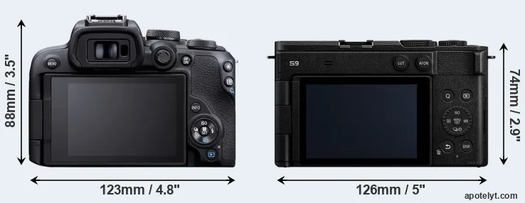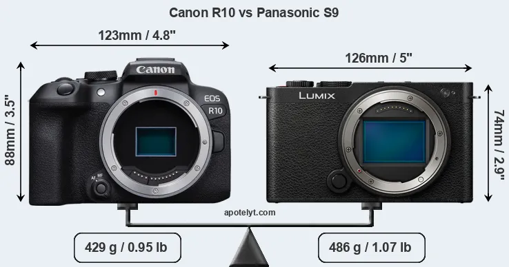 The side-by-side display below illustrates the physical size and weight of the Canon R10 and the Panasonic S9. The two cameras are presented according to their relative size. Three consecutive perspectives from the front, the top, and the back are available. All width, height and depth measures are rounded to the nearest millimeter.
