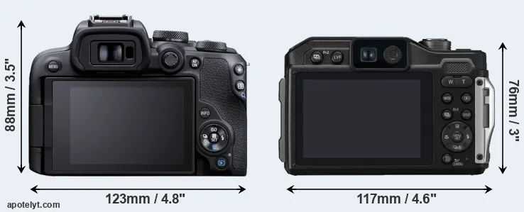The above size and weight comparisons are to some extent incomplete and possibly misleading, as the TS7 has a lens built in, whereas the R10 is an interchangeable lens camera that requires a separate lens. Attaching the latter will add extra weight and bulk to the setup.